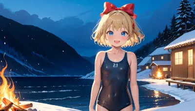 1girl,seductive smile,blue eyes,POV,blond hair,short hair,(hair bow:1.5),red bow,