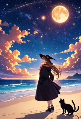 best quality, Many stars twinkling in a beautiful bright winter night sky, in the sandy beach, a young witch with long hair with her hands in her coat pockets looking up at it, buddy black cat, amazing, 8k, extremely beautiful and fain design, extremely beautiful and fain colors, dynamic production, a sandy beach,, 8k, ,happy new year,2025,, <lora:saturation:1> <lora:make25d_type4_v100:1>