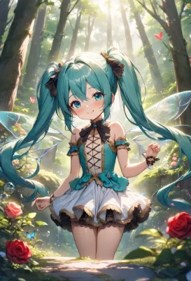 masterpiece, best quality, extremely detailed, anime, girl, Hatsune Miku, VOCALOID, blue-green long twintails, blue eyes, mini skirt, gold frilled gothic Lolita-style dress, clear blue fairy with transparent wings, beautiful, cute, smiling, soft sunlight filtering through a sacred forest sanctuary, spring, blooming red roses, sparkling water splashes, mysterious, fantastical, butterflies