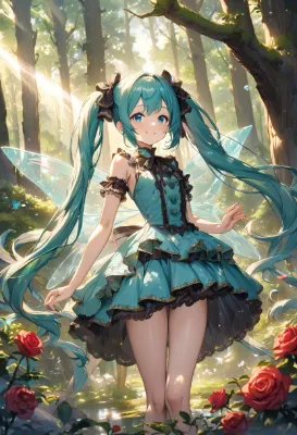 masterpiece, best quality, extremely detailed, anime, girl, Hatsune Miku, VOCALOID, long twintails in blue-green color, blue eyes, mini skirt, fairy girl with a yellow frilly gothic Lolita-style dress and clear blue transparent wings, beautiful, cute, smile, soft sunlight shining into a sacred forest sanctuary, spring, red roses in bloom, sparkling splashes of water, mysterious, fantastical, butterfly