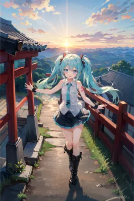 masterpiece, best quality, extremely detailed, anime, girl, 初音ミク, VOCALOID, blue-green long twintails, blue eyes, miniskirt, sleeveless, black long boots, black arm covers, necktie, headphones, beautiful girl, smiling, cute, sunrise from Mount Fuji, red torii gate, mysterious, fantastical, first sunrise