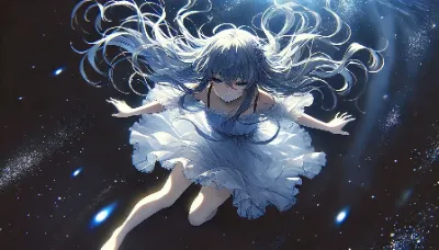 A modern Japanese anime-style illustration with a slightly realistic touch. The character is a girl with long, straight, light blue hair wearing a flowing white dress. The design is characterized by precise and intricate ruffles and an elegant, refined and cohesive look. The ruffles are naturally integrated and complement the graceful, delicate appearance of the dress. Looking down from a low angle vantage point, her intimidating presence is still present as she smiles confidently with a closed mouth and a bashful smile. The setting is a very dark room, with deep shadows and minimal lighting adding to the ominous mood. The composition is a medium shot from the front, emphasizing her intimidating posture and expression with very refined details and textures. The girl is surrounded by a myriad of mathematical formulas.