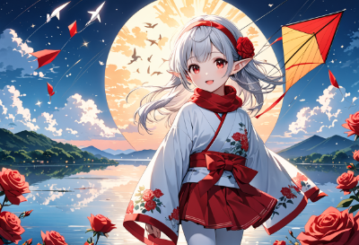 8K,((cinematic light,masterpiece,best quality,Ultra extremely detailed,perfect anatomy,detailed,high-resolution,highres,extremely detailed,perfect 5+fingers:1.5,sharp focus:1.5,),(high-contrast:1.6,strong back-light,close-up face,rose Flowers print ,child elf wearing glossy decoration white kimono,with sparkle reflected light,big ribbon,knit head band,knit short-skirt,cute tights,long knit scarf)),looking at viewer:1.5, (extra detailed red Eyes with reflection), waving shining long white hair_with curly,elf ear with big earrings,smile,open mouth,blush,lipstick,full fresh lips,wet-lip,big hip,small breasts,soft wind,armpit,(holding a kite:1.4),BREAK,((Kite flying)),((japanese Kite flying)),sunrise,shooting stars, round many stars,Grus japonensis, birds,mount and silent lake in the distance,dark cloud, big white roses,BREAK,text of ”2025” in kite,(((2025 year))),<lora:hohoaka:1> <lora:make25d_type1_v100:1>,,