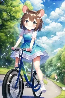 masterpiece, best quality, ,masterpiece, best quality, masterpiece, best quality, masterpiece, best quality,1girl, solo, chibi, animal_ears, squirrel_ears,squirre _tail, brown_hair, short_hair, whiskers, rosy_cheeks, round_eyes, shiny_eyes, wide_smile, blue_dress, white_bib, squirrel_on_bicycle, tiny_bicycle, cute_squirrel, spinning_wheels, sparkling_eyes, watercolor_style, outdoors, vibrant_colors, bright_day, fluffy_clouds, green_grass, small_town_background, town_houses, blooming_flowers, tree-lined_road, clear_blue_sky, playful_pose, full_body_shot, on_bicycle, hands_on_handlebars, feet_on_pedals."