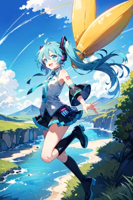 masterpiece, best quality, extremely detailed, anime, girl, Hatsune Miku, VOCALOID, blue-green long twintails, blue eyes, miniskirt, necktie, headphones, sleeveless, black long boots, black arm covers, blue sky, girl enjoying kite flying by the riverbank, beautiful, cute, smiling, kite flying, snake
