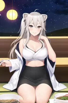 masterpiece, best quality, {{{{masterpiece}}}}, {{{{highly detailed}}}}, 1girl, full body, {{{{{{shishiro botan}}}}}}, silver hair, two side up, {{frizzy hair}}, lion ears, gray eyes, {{{{black mods coat + far}}}}, black sleeveless inner, navel baring, {black side zipper skirt}, string bread, claw pose, naughty smile, {Starry night sky}, {{{complex pattern}}}, hyperrealistic, {{{{{temple}}}}}, {{{{{{japanese cloth}}}}}}, chime,