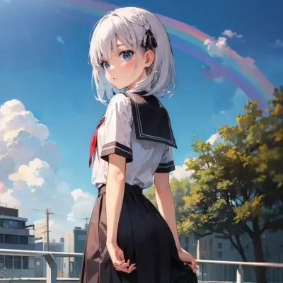 very cute female child,10 yo, white hair, bangs,medium hair,blue eyes,hair ribbon,flat chest,