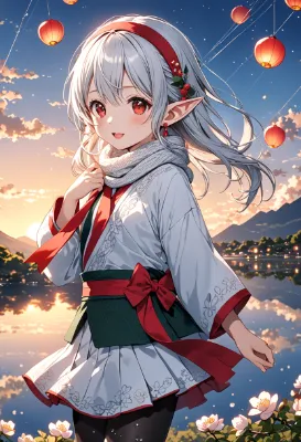 8K,((cinematic light,masterpiece,best quality,Ultra extremely detailed,perfect anatomy,detailed,high-resolution,highres,extremely detailed,perfect 5+fingers:1.5,sharp focus:1.5,)),((high-contrast:1.6,strong back-light,close-up face,plum print , elf wearing glossy decoration white body-suit,with sparkle reflected light,long ribbon,knit head band,knit short-skirt,cute tights,long knit scarf)),looking at viewer:1.5, (extra detailed red Eyes with reflection), waving shining long white hair_with curly,elf ear with big earrings,smile,open mouth,blush,lipstick,full fresh lips,wet-lip,big hip,small breasts,soft wind,armpit,BREAK,plum flower,((Japanese apricot)),shooting stars, round many stars,birds,city and silent lake in the distance,dark cloud, big white roses,<lora:hohoaka:1> <lora:make25d_type1_v100:1>,,,