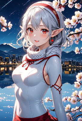 8K,((cinematic light,masterpiece,best quality,Ultra extremely detailed,perfect anatomy,detailed,high-resolution,highres,extremely detailed,perfect 5+fingers:1.5,sharp focus:1.5,)),((high-contrast:1.6,strong back-light,close-up face,flower print , elf wearing glossy decoration white knit body-suit,cloth jacket,with sparkle reflected light,long ribbon,knit head band,knit short-skirt,cute tights,long knit scarf)),looking at viewer:1.5, (extra detailed red Eyes with reflection), waving shining long white hair_with curly,elf ear with big earrings,smile,open mouth,blush,lipstick,full fresh lips,wet-lip,big hip,small breasts,soft wind,armpit,BREAK,plum flower,((Japanese apricot)),shooting stars, round many stars,birds,city and silent lake in the distance,dark cloud, big white roses,<lora:hohoaka:1> <lora:make25d_type1_v100:1>,,,,,,