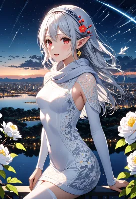 8K,((cinematic light,masterpiece,best quality,Ultra extremely detailed,perfect anatomy,detailed,high-resolution,highres,extremely detailed,perfect 5+fingers:1.5,sharp focus:1.5,)),((high-contrast:1.6,strong back-light,close-up face,flower print , elf wearing glossy decoration white knit body-suit,cloth jacket,with sparkle reflected light,long ribbon,knit head band,knit short-skirt,cute tights,long knit scarf)),looking at viewer:1.5, (extra detailed red Eyes with reflection), waving shining long white hair_with curly,elf ear with big earrings,smile,open mouth,blush,lipstick,full fresh lips,wet-lip,big hip,small breasts,soft wind,armpit,BREAK,plum flower,((Japanese apricot)),shooting stars, round many stars,birds,city and silent lake in the distance,dark cloud, big white roses,<lora:hohoaka:1> <lora:make25d_type1_v100:1>,,,,,,