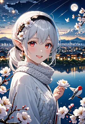 8K,((cinematic light,masterpiece,best quality,Ultra extremely detailed,perfect anatomy,detailed,high-resolution,highres,extremely detailed,perfect 5+fingers:1.5,sharp focus:1.5,)),((high-contrast:1.6,strong back-light,close-up face,flower print , elf wearing glossy decoration white knit body-suit,with sparkle reflected light,cloth-coat,long ribbon,knit head band,knit short-skirt,cute tights,long knit scarf)),looking at viewer:1.5, (extra detailed red Eyes with reflection), waving shining side-ponytail:1.5 white hair with curly,elf ear with big earrings,smile,open mouth,blush,lipstick,full fresh lips,wet-lip,big hip,small breasts,soft wind,armpit,side-ponytail,BREAK,shooting stars, round many stars,birds,city and silent lake in the distance,dark cloud, big white roses,<lora:hohoaka:1> <lora:make25d_type1_v100:1>,