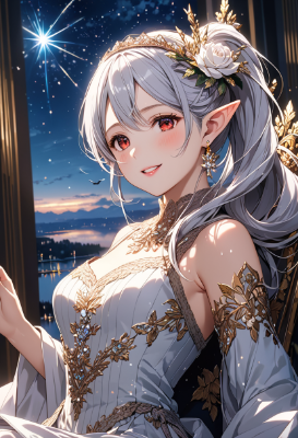 8K,((cinematic light,masterpiece,best quality,Ultra extremely detailed,perfect anatomy,detailed,high-resolution,highres,extremely detailed,perfect 5+fingers:1.5,sharp focus:1.5,)),((high-contrast:1.6,strong back-light,close-up face,flower print , girl elf queen wearing glossy decoration light-violet knit body-dress,with sparkle reflected light,cloth-coat,long ribbon,knit head band,knit short-skirt,cute tights,long knit scarf)),looking at viewer:1.5, (extra detailed red Eyes with reflection), waving shining side-ponytail:1.5 white hair with curly,elf ear with big earrings,smile,open mouth,blush,lipstick,full fresh lips,wet-lip,big hip,small breasts,soft wind,armpit,side-ponytail,tilt head,on a grand throne,BREAK,(((Queen))),BREAK,shooting stars, round many stars,birds,city and silent lake in the distance,dark cloud, big white roses,<lora:hohoaka:1> <lora:make25d_type1_v100:1>,