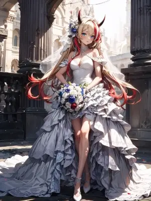 1woman, solo, full body, oni horns, (heterochromia:1.2), red eyes, red hair, (multicolored hair:1.2), blonde hair, blue eyes, (streaked hair:1.2), bangs, long hair BREAK (wedding dress:1.5), Bouquet, BREAK black background, <lora:KK_paperCut_v5:0.85>, high contrast, Negative prompt: EasyNegativeV2, nsfw, 3D Steps: 50, Sampler: Euler, CFG scale: 7, Seed: 2081122153, Size: 2048x2720, Model hash: 0805b136eb, Model: breakdomain_M2150, Denoising strength: 0.35, Clip skip: 2, Tiled Diffusion upscaler: 4x-AnimeSharp, Tiled Diffusion scale factor: 2, Tiled Diffusion: {\"Method\": \"MultiDiffusion\", \"Tile tile width\": 96, \"Tile tile height\": 96, \"Tile Overlap\": 48, \"Tile batch size\": 1, \"Upscaler\": \"4x-AnimeSharp\", \"Upscale factor\": 2, \"Keep input size\": true, \"NoiseInv\": true, \"NoiseInv Steps\": 25, \"NoiseInv Retouch\": 1, \"NoiseInv Renoise strength\": 1, \"NoiseInv Kernel size\": 64}, Lora hashes: KK_paperCut_v5: e9ab1ef520ee, Version: v1.3.0