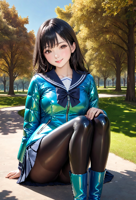 shiny pink down jacket:1.2), (sailor collar:1.3), pleated skirt, (enamel knee high boots:1.1), park, sit on thebench, green glassland, blue sky