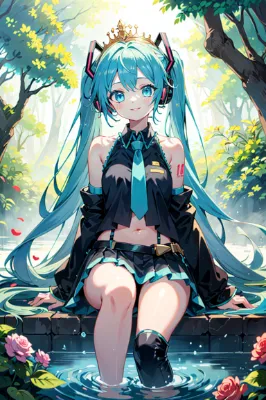 masterpiece, best quality, extremely detailed, anime, girl, skirt, Hatsune Miku, VOCALOID, blue-green long twintails, mini skirt, fairy girl with transparent and sparkling blue wings wearing a pink frilly gothic Lolita dress adorned with a golden tiara, princess, sitting on a throne with shining blue jewels, elf, beautiful girl, smiling, cute, crystal-clear water flowing over a serene waterfall, playful birds, a pink rose garden sanctuary in the forest with soft sunlight filtering through, blue butterflies fluttering, paradise, mysterious, fantastical, fantasy