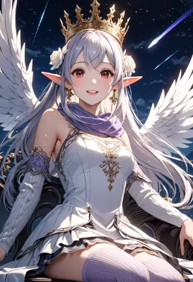 8K,((cinematic light,masterpiece,best quality,Ultra extremely detailed,perfect anatomy,detailed,high-resolution,highres,extremely detailed,perfect 5+fingers:1.5,sharp focus:1.5)),((high-contrast:1.6,strong back-light,close-up face,flower print , girl elf wearing glossy decoration light-violet knit body-dress,with sparkle reflected light,cloth-coat,long ribbon,knit head band,knit short-skirt,cute tights,long knit scarf,gown)),looking at viewer:1.5, (extra detailed red Eyes with reflection), waving shining side-ponytail:1.5 white hair with curly,elf ear with big earrings,smile,open mouth,blush,lipstick,full fresh lips,wet-lip,big hip,small breasts,soft wind,armpit,side-ponytail,tilt head,laying on floor,BREAK,shooting stars, round many stars,birds,city and like mirror floor in the distance,dark cloud, big white roses,<lora:hohoaka:1> <lora:make25d_type1_v100:1>,,
