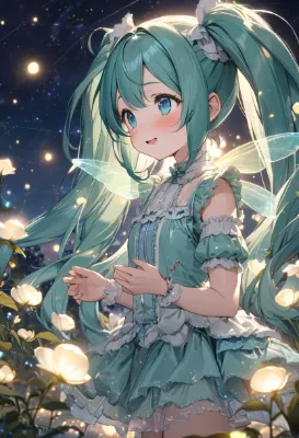 masterpiece, best quality, extremely detailed, anime, girl, skirt, Hatsune Miku, VOCALOID, blue-green long twintails, girl, mini skirt, blue eyes, night flower field, pink roses blooming, transparent pure water fountain, blue-green cute frilled gothic lolita style outfit, clear transparent wings fairy girl, elf, beautiful girl, cutely innocently smiling while looking at the starry sky, constellation in the night sky, fantastical, mystical, musical notes, keyboard, starry sky