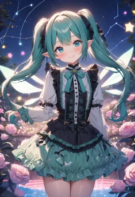 masterpiece, best quality, extremely detailed, anime, girl, skirt, Hatsune Miku, VOCALOID, blue-green long twintails, mini skirt, blue eyes, night flower field, pink rose flowers blooming, transparent pure water fountain, fairy girl with light blue transparent wings in cute frilly gothic lolita style clothes, elf, beautiful girl, cutely and innocently laughing while gazing at the constellation in the night sky, starry sky, fantastical, mysterious, musical notes, keyboard, Gemini fairy twin girls, Gemini constellation fairies