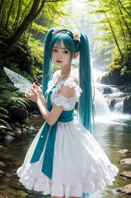 masterpiece, best quality, extremely detailed, anime, girl, skirt, Hatsune Miku, VOCALOID, long twin-tails in blue-green, girl with blue eyes, sacred forest sanctuary, soft sunlight filtering through, white rose flowers blooming, transparent fairy girl in a pure white frilly gothic Lolita-style dress with clear blue ethereal fairy wings, elf, beautiful girl, blue bird, waterfall, clear stream, sparkling water splashes, fantastical, mysterious, fantasy