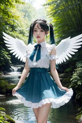 masterpiece, best quality, extremely detailed, anime, girl, skirt, Hatsune Miku, VOCALOID, blue-green long twintails, girl, mini skirt, blue eyes, sacred forest, soft sunlight filtering through, white roses blooming, pure white angel with frilly gothic lolita dress and wings, beautiful girl, blue bird, waterfall, clear stream, sparkling splashes of water, fantastical, mystical, fantasy