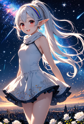 8K,((cinematic light,masterpiece,best quality,Ultra extremely detailed,perfect anatomy,detailed,high-resolution,highres,extremely detailed,sharp focus:1.5)),((high-contrast:1.6,strong back-light,close-up , from_back,flower print , child elf wearing glossy decoration white body-dress with sparkle reflected light,long rainbow ribbon,knit-head-band,knit short-skirt,bikini-thong,cute tights,long wide scarf)),looking at viewer:1.5, (extra detailed red Eyes with reflection), waving shining side-ponytail:1.5 white hair with curly,elf ear with big earrings,smile,open mouth,blush,lipstick,full fresh lips,wet-lip,big hip,small breasts,soft wind,armpit,ponytail,open her legs,BREAK,((galaxy,zodiac sign)),night,sky,shooting stars, round many stars,birds,city in the distance,dark cloud, big white roses,<lora:hohoaka:1> <lora:make25d_type1_v100:1>,,,,,