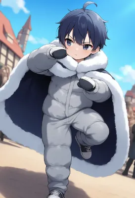 down jacket, snowsuit, coveralls, padded puffy pants, padded clothes, oversized clothes, heavy clothes, thick clothes, chunky clothes, shiny clothes, {{{padded puffy fluffy fur-trimmed cape}}}, fur-trimmed sleeves, fur-trimmed cuffs, fur-trimmed hood, blanket cape, padded lining, puffy mittens, cute girl, loli, contrapposto, solo, sneakers, against railing, looking to the side, city lights, light smile, dutch angle, sitting, , rating:general, best quality, very aesthetic, absurdres