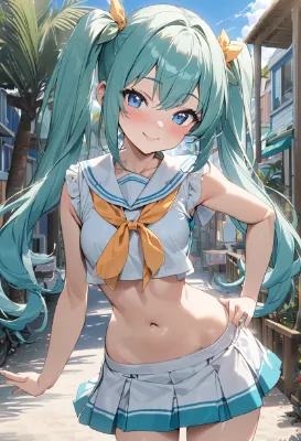 masterpiece, best quality, extremely detailed, anime, girl, skirt, 初音ミク, VOCALOID, blue-green long twintails, blue eyes, girl, mini skirt, sailor outfit, coastal town, palm tree lined beachside path, beautiful girl, cute, smile, blue sky, sea, summer
