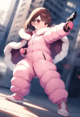 down jacket, puffy pants, padded straitjacket, harness, chest harness, harness belt, restrained, bondage, ball gag, legbinder, wrapped up, locking, cute girl, loli, contrapposto, solo, sneakers, standing, against wall, looking to the side, worried, prison, sweatdrop, chasing, , rating:general, best quality, very aesthetic, absurdres