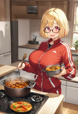 1 girl,blonde bob,garnet eyes,glasses,big breasts,joy, :p ,tracksuit,T shirt,Kitchen, pot on stove, curry in pot, tasting,holding Ladle, A little curry in a ladle, <lora:hyperdetailer_v060.safetensors:1> <lora:kotatsu:0.7>