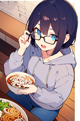 a drawing of a drawing of a cartoon woman in sweats with glasses, 1girl, solo, hood, under rim metal glasses, hoodie, pants, black hair, looking at viewer, blue eyes, short hair, white hoodie, open mouth, long sleeves, denim,eating ramen,ramen restaurant <lora:flat1:1>