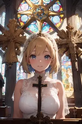 highres, ultra detailed, beautiful, (masterpiece, best quality:1.4), detailed background, (1 girl, solo:1.3),(blonde short hair), (wedding dress:1.2), tac000_style, neon_palette, shaped_highlights, colorful_hair, (in church:1.5),(baroque:1.5),God Light,(intricate),Stained glass,skylight,(divine,Holy,goddess:1.3),<lora:tac000_loha:1>