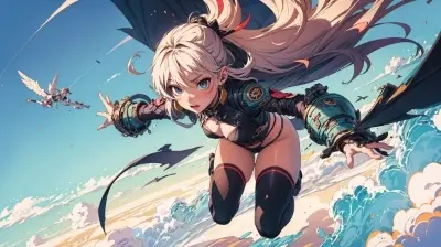 In the midst of an aerial battle between the angelic and demonic races, the skies become a battleground for their clash. Among the throngs of celestial beings, a young girl with a voluptuous figure represents the angelic side, while a slender woman embodies the demonic forces. The airspace is filled with numerous angels and demons engaged in fierce combat, creating an atmosphere of chaos and intensity.
