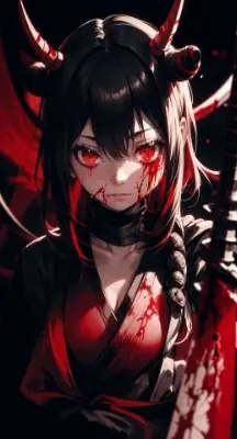low angle, (wide view:1.3), [close-up], (1 stylish samurai:1.3), demon horn, (dynamic action:1.2), raging, beautiful-katana, (Slashing:1.5), (blood spatter:1.3), (stained with the blood:1.3), (cruel and crazy eyes), (eyes glowing red in the dark:1.4), nsfw, (cruelty:1.5) <lora:flat:-0.5>