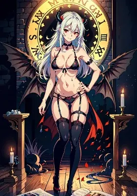 demon girl, highly detailed beautiful face and eyes, red eyes, beautiful long white hair, straight hair, blush, naughty smile, open mouth ahoge,