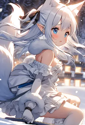 bash, blue eyes, pointy ears, fox ears, fox tail, fluffy tail, , hair ribbon,