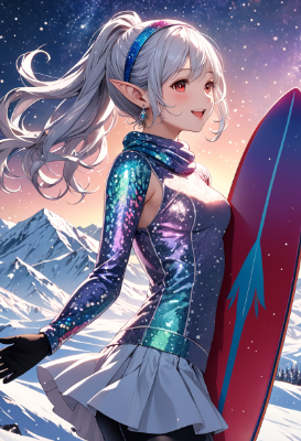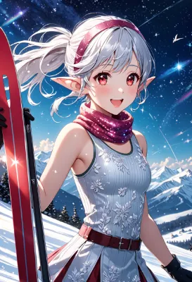 8K,((cinematic light,masterpiece,best quality,Ultra extremely detailed,perfect anatomy,detailed,high-resolution,highres,extremely detailed,sharp focus:1.5)),strange pose,((high-contrast:1.6,strong back-light,close-up , from_back:1.5,back,flower print , child elf wearing glossy decoration glitter light pink ski-wear with brilliant sequins and flills,light rainbow head-band,short skirt,rainbow knit scarf,gloves:1.5,tights)),looking at viewer:1.5, (extra detailed red Eyes with reflection), glitter waving shining side-ponytail:1.5, (white hair with curly),elf ear with big earrings,big smile,wide open mouth,blush,lipstick,full fresh lips,wet-lip,big hip,big small breasts,soft wind,armpit,ponytail,skiing,BREAK,snowy mountains,galaxy,night sky,shooting stars, round many stars,birds,glitter city in the distance,dark cloud, big white roses,<lora:hohoaka:1> <lora:make25d_type1_v100:1>,,,,