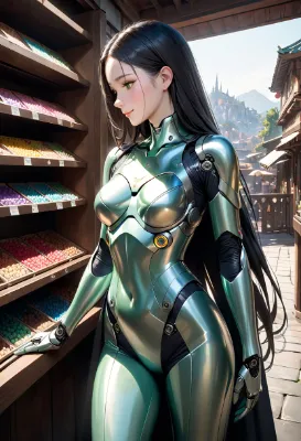 (photorealistic:1.4), (RAW photo), masterpiece, best quality, extremely detailed, lady, (cyborg:1.1), neat and clean, elegant, polite, shy, black long hair, almond eyes, smile, (mechanical:1.4), (metallic:1.2), silver high-necked body suit, full sleeves, corset, BREAK, (mint green:1.1), breastplate, long gloves, knee-high boots, shopping, grand bazaar