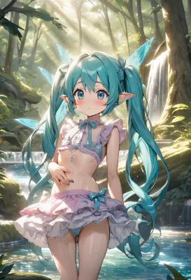 masterpiece, best quality, extremely detailed, anime, girl, 初音ミク, VOCALOID, long twin tails in blue-green color, blue eyes, mini skirt, pink frilly gothic lolita style bikini swimsuit, clear transparent fairy wings, elf, sun-dappled sanctuary in the forest, waterfall, stream, sparkling water droplets, fantastical, mysterious, fantasy, paradise, magical girl, magic