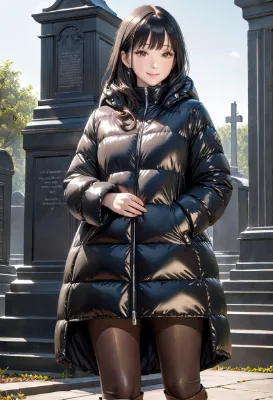 (photorealistic:1.4), (RAW photo), masterpiece, best quality, extremely detailed, lady, neat and clean, elegant, polite, shy, black long hair, almond eyes, smile, tight, ivory knit sweater, (shiny white beige pink puffer down jacket:1.2), navy jeans, (brown leather long boots:1.1), university, campus