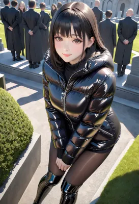(photorealistic:1.4), (RAW photo), masterpiece, best quality, extremely detailed, lady, neat and clean, elegant, polite, shy, black long hair, almond eyes, smile, (shiny white beige puffer down jacket:1.2), closed zipper, (navy jeans:1.1), (dark brown leather knee high boots:1.2), standing, university, campus, cold day