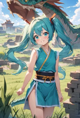 masterpiece, best quality, extremely detailed, anime, girl, Hatsune Miku, VOCALOID, long twin tails in greenish-blue color, blue eyes, girl wearing martial artist clothing, beautiful, cute, smiling, dragon, grassland, ancient brick ruins, blue sky, Dragon Quest, fantasy
