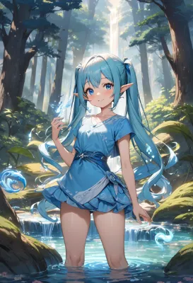 masterpiece, best quality, extremely detailed, anime, girl, Hatsune Miku, VOCALOID, long twin tails in blue-green, blue eyes, mini skirt, green dress girl, elf, beautiful girl, cute, smiling, sun rays shining through the forest, forest spirit, green magic, fantasy, dreamy, mysterious