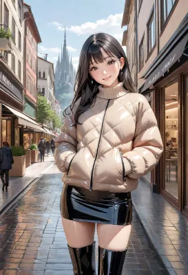 (photorealistic:1.4), (RAW photo), masterpiece, best quality, extremely detailed, lady, neat and clean, elegant, polite, shy, black long hair, almond eyes, smile, enamel, rubber, leather, shiny black puffer down jacket, mourning clothes, pantyhose, knee high boots, funeral, participants