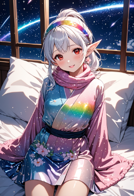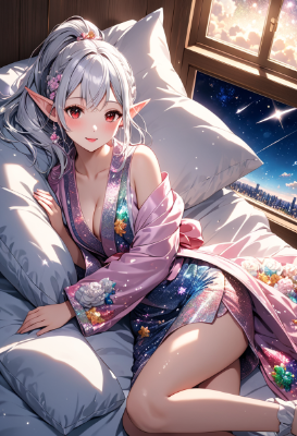8K,((cinematic light,masterpiece,best quality,Ultra extremely detailed,perfect anatomy,detailed,high-resolution,highres,extremely detailed,sharp focus:1.5)),((high-contrast:1.6,strong back-light,close-up , from_above:1.5,back,flower print , child elf wearing glossy decoration glitter light pink kimono with brilliant sequins and flills,short skirt,rainbow knit scarf,hairgrip:1.5,hairpin)),looking at viewer:1.5, ((extra detailed red Eyes with reflection)), glitter waving shining ponytail:1.5, (white hair with curly),elf ear with big earrings,big smile,wide open mouth,blush,lipstick,full fresh lips,wet-lip,big hip,big small breasts,armpit,ponytail,sleeping in bed,laying,BREAK,bed,covered futon, in room,galaxy,night sky,shooting stars, round many stars,birds,glitter city in the distance,dark cloud, big white roses,<lora:hohoaka:1> <lora:make25d_type1_v100:1>,,,,,