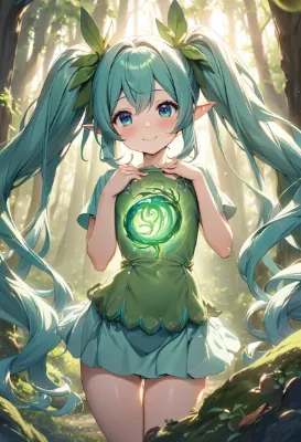masterpiece, best quality, extremely detailed, anime, girl, 初音ミク, VOCALOID, long twintails in blue-green color, white flower hairpin, blue eyes, mini skirt, gothic lolita outfit in blue-green color with frills, elf girl, beautiful, smiling, cute, forest with sunlight filtering through trees, colorful mushrooms growing, blue bird playing, fantastical, mysterious, fantasy