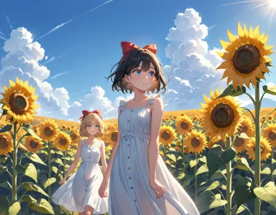 2girls,small height,blonde hair,blue eyes,short bob cut,(hair bow:1.3),red bow,black long straight hair,school uniform,pleated skirt,white blouse,backpack,(casual standing pose:1.2),waiting pose,side by side,morning scene,suburban street,(yellow school bus in background:1.2),clear blue sky,gentle sunlight,tree-lined street,(soft morning lighting:1.1),cute smile,innocent expression,white socks,brown school shoes,(anime style:1.3),depth of field,(masterpiece:1.2),best quality,very aesthetic,absurdres,