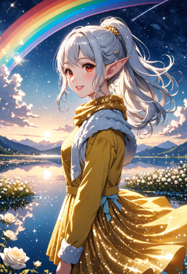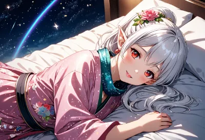 8K,((cinematic light,masterpiece,best quality,Ultra extremely detailed,perfect anatomy,detailed,high-resolution,highres,extremely detailed,sharp focus:1.5)),((high-contrast:1.6,strong back-light,close-up , from_above:1.5,back,flower print , child elf wearing glossy decoration glitter light yellow dress with brilliant sequins and flills,short skirt,yellow jacket,rainbow knit scarf)),looking at viewer:1.5, ((extra detailed red Eyes with reflection)), glitter waving shining ponytail:1.5, (white hair with curly),elf ear with big earrings,big smile,wide open mouth,blush,lipstick,full fresh lips,wet-lip,big hip,big small breasts,armpit,ponytail,sleeping in bed,BREAK,sikent lake, in room,galaxy,night sky,shooting stars, round many stars,birds,glitter city in the distance,dark cloud, big white roses,<lora:hohoaka:1> <lora:make25d_type1_v100:1>,,,,,,