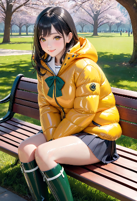 (photorealistic:1.4), (RAW photo), masterpiece, best quality, extremely detailed, lady, (maid:1.1), neat and clean, elegant, polite, shy, black long hair, almond eyes, smile, high necked, closed zipper, tight, (shiny yellow down coat:1.2), white brim, (enamel, rubber, leather:1.1), corset, knee high boots, shopping, greengrocer, street stall, evening