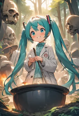 masterpiece, best quality, extremely detailed, anime, girl, Hatsune Miku, VOCALOID, long twin tails in blue-green, mini skirt, elf girl in green clothes, sunlight streaming through the forest, large pot filled with stew, fantasy, magical, cooking, forest dining table
