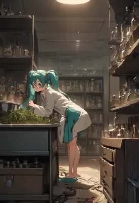 masterpiece, best quality, extremely detailed, anime, girl, Hatsune Miku, VOCALOID, long twin tails in teal, skirt, girl in white coat with spiral glasses, beautiful girl, cute, smiling, creating suspicious potion in a large pot, shelves lined with bottles of medicinal herbs, old hospital in dim forest setting, skull, mad doctor, dark fantasy